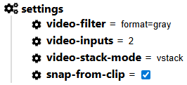 video-codecstring = copy The codec for exported video clips encoding.video-resolutionstring Resolution (ie. 640x480) of exported video clipsvideo-frame-rateint Frame rate of exported video clipsvideo-formatstring Format (ie. mp4) of exported video clipsvideo-filterstring FFmpeg complex filter to apply on each exported video clipvideo-posterstring = snap (snap,details,waveform) Script for video poster generationvideo-inputint = 1 Which video input to choose from when multiple are availablevideo-inputsint = 1 Number of video inputs from a corpus file, to use when building clipsvideo-stack-modestring = hstack (hstack,vstack) The stacking mode to combine multiple inputsposter-resolutionstring Resolution of exported poster (ie. 640x480)snap-offsetstring = 0% Offset to capture snapshot (in milliseconds, or percentage with %)snap-from-clipbool = false Capture snapshot from the final exported clip